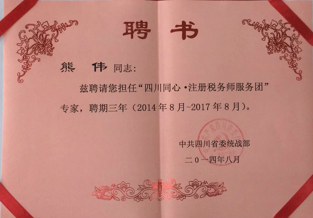 自2012年5月成立至今,“四川同心·注冊稅務(wù)師服務(wù)團”在四川省委統(tǒng)戰(zhàn)部領(lǐng)導(dǎo)下已建立31個分團。我有幸擔任內(nèi)江分團的團長感到很榮幸,我明白作為四川注稅同心團團員,在助人的同時,也是自助。我們也可以從中得到思想上的升華,學會與人溝通,學會關(guān)愛他人,也更深刻地領(lǐng)會到生命的意義——奉獻。我很榮幸能加入這個以傳遞愛心、服務(wù)社會為宗旨的團隊,我們將盡全力伸出雙手去幫助、關(guān)心孤寡老人,孤殘兒童、困境企業(yè)等有困難的弱勢群體。