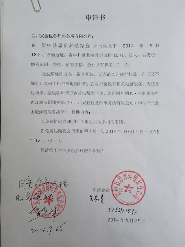 為托起困境企業(yè)騰飛的翅膀,為解決當(dāng)?shù)囟悇?wù)分局征管上的難題,四川同心·注冊稅務(wù)師服務(wù)團(tuán)團(tuán)員單位(四川興鑫稅務(wù)師事務(wù)所有限公司)愿為這些請不起會計、又無力自行申報的農(nóng)庭農(nóng)場進(jìn)行涉稅服務(wù)免費援助。目前共20戶家庭農(nóng)場申請了困境企業(yè)涉稅服務(wù)免費扶助(詳見后附申請書)